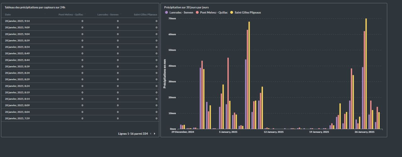 L’objectif était de fournir un outil opérationnel aux techniciens et élus, afin de suivre l’évolution des précipitations, surveiller les niveaux d’eau, analyser les tendances et activer les procédures de prévention en temps utile.