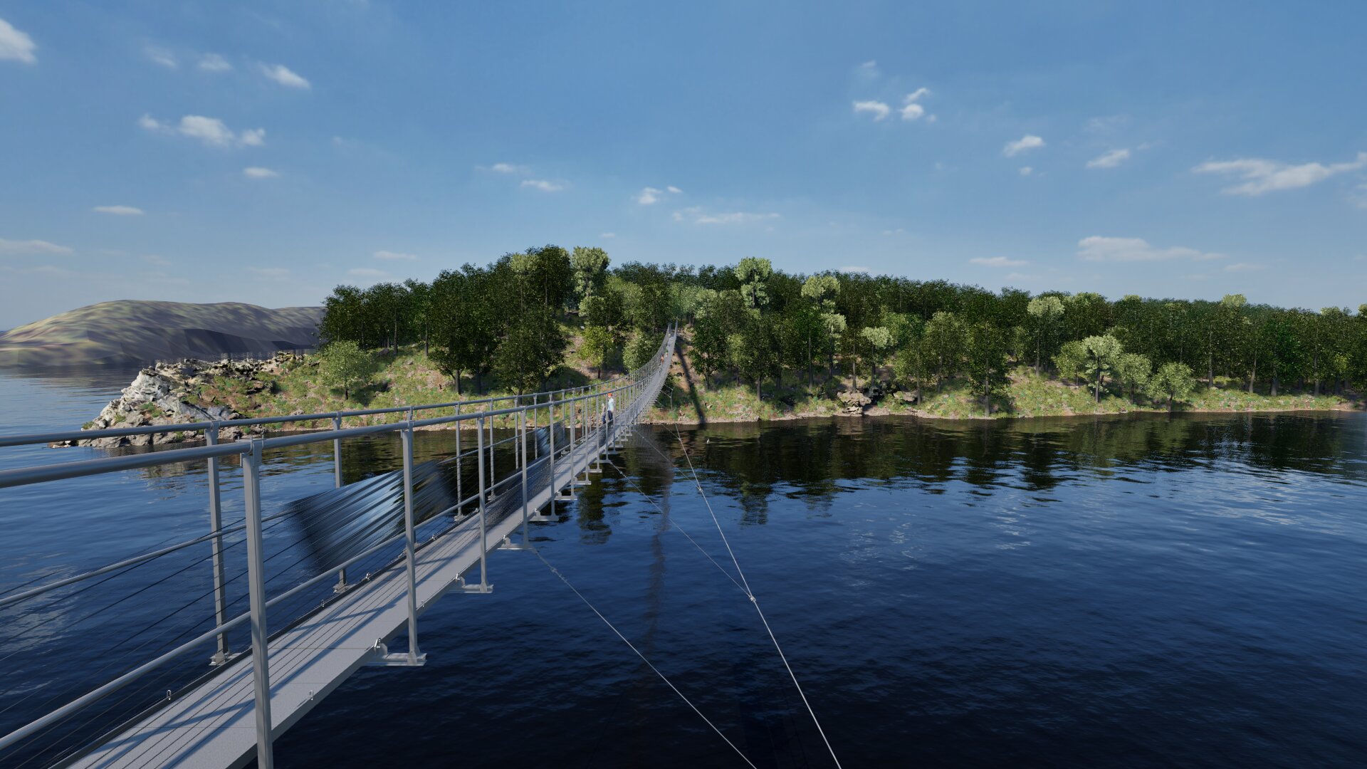 Pour préparer l’implantation de la passerelle himalayenne de Guerlédan, Breizh Mapping a réalisé une modélisation 3D complète du site et a intégré le futur ouvrage.